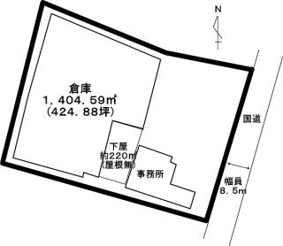 | 建物構造 | 倉庫 鉄骨造合金メッキ鋼板ぶき 平家建 | 床面積 | 1,404.69u (424.88坪) |